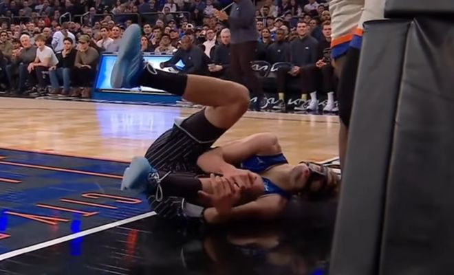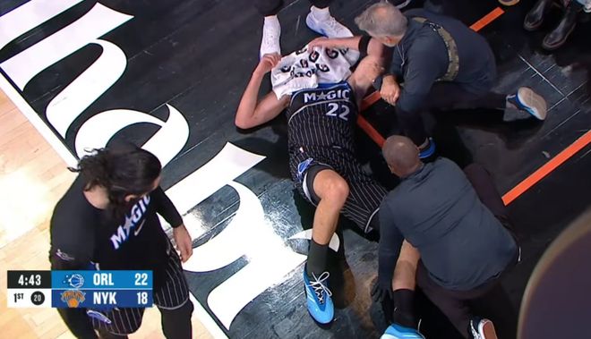 首節還剩4分43秒時,小瓦格納完成對布倫森的搶斷后,率先沖至籃下埋伏,隊友布萊克為其送出空接傳球,尼克斯內線胡克波爾蒂在封蓋傳球的過程中對小瓦格納犯規。小瓦格納落地姿勢十分別扭,隨即痛苦地抱住左膝。