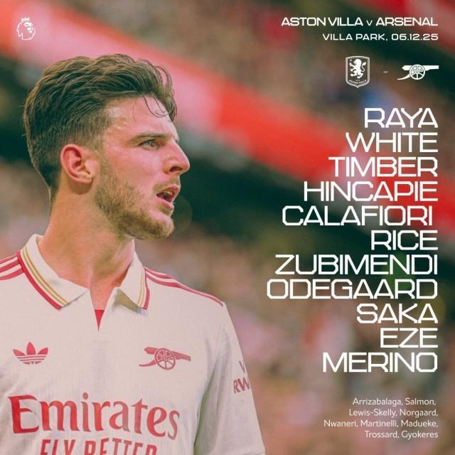 英超第15輪,阿森納客戰阿斯頓維拉,賽前阿森納首發陣容已經出爐,具體名單如下: 阿森納首發:拉亞 / 本·懷特、廷伯、因卡皮耶、卡拉菲奧里 / 賴斯、蘇維門迪、厄德高 / 薩卡、梅里諾、埃澤
