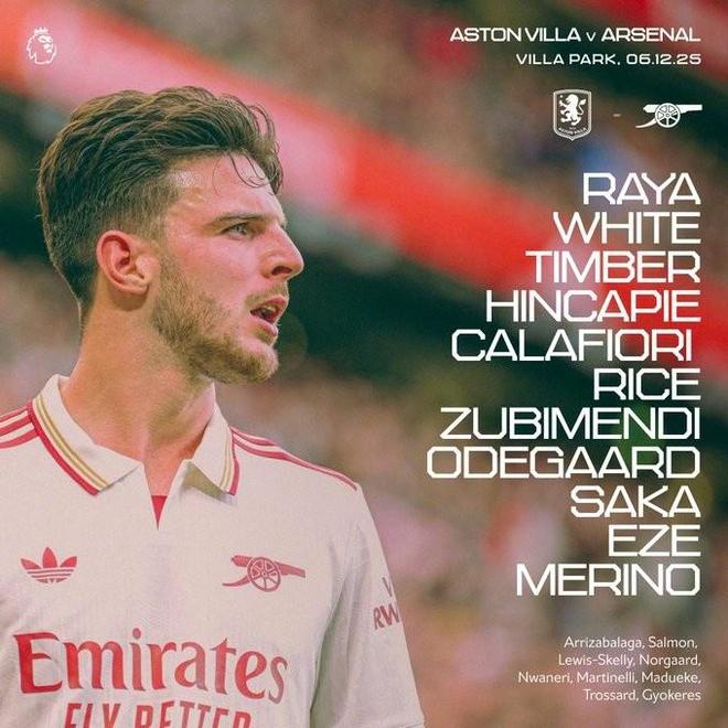 阿森納首發:1-戴維-拉亞、4-本-懷特、12-廷貝爾、5-因卡皮耶、33-卡拉菲奧里、41-賴斯、36-蘇比門迪、8-厄德高、7-薩卡、10-埃澤、23-梅里諾
