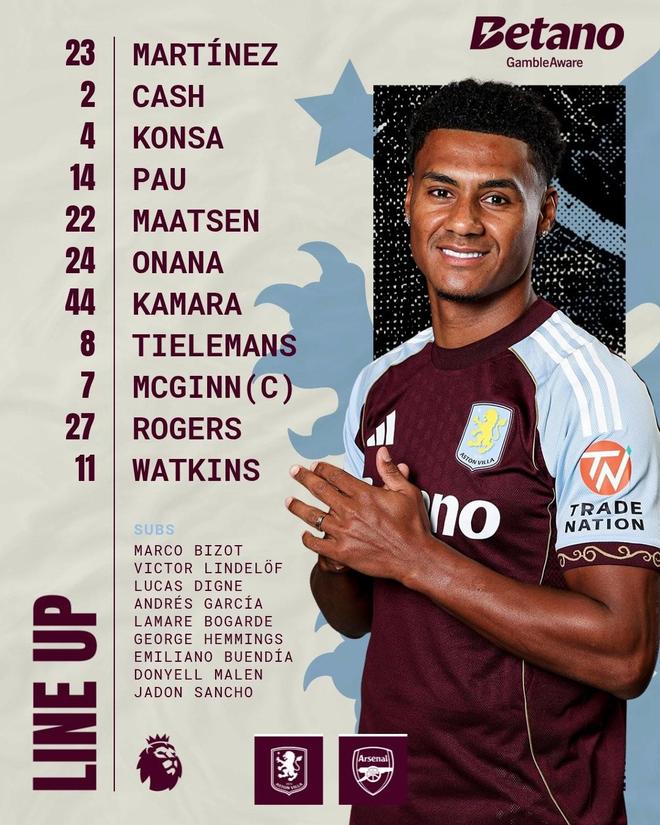 阿斯頓維拉首發:23-達米安-馬丁內斯、2-卡什、4-孔薩、14-保-托雷斯、22-馬特森、24-阿馬杜-奧納納、44-布巴卡爾-卡馬拉、8-蒂勒曼斯、7-麥金、27-摩根-羅杰斯、11-沃特金斯