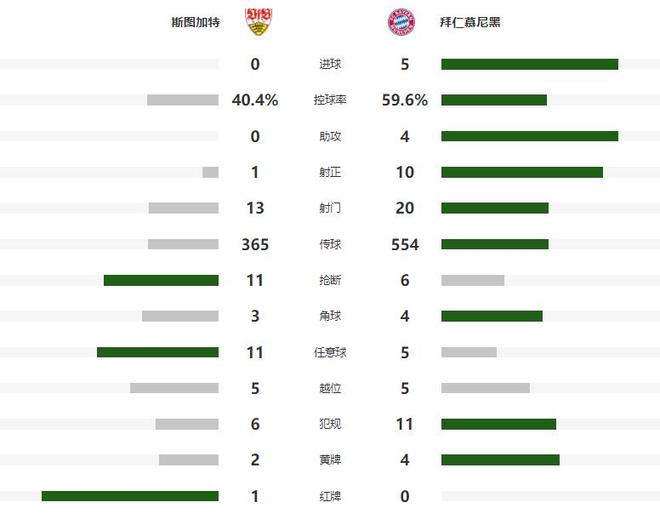 不過第66分鐘替補登場的凱恩,還是幫助拜仁終結了勝負的懸念,大禁區前沿突施冷箭,攻破了斯圖加特的球門,將比分改寫為了2-0,攻勢不減的南大王,第78分鐘靠著斯坦尼西奇的進球,將領先的優勢擴大到了3球,3分鐘之后,奧利塞又為球隊贏得點球,凱恩主罰命中上演梅開二度的好戲,比賽最后時刻,奧利塞助攻凱恩再入一球,將全場比分定格為了5-0。